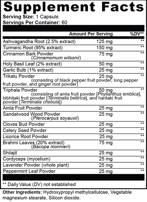 Ingredients:Â Ashwagandha Root (2.5% extract), Turmeric Root (95% extract), Cinnamon Bark Powder (Cinnamomum wilsonii), Holy Basil Leaf (2% extract), Garlic Bulb (1% extract), Trikatu Powder (consisting of black pepper fruit powder, long pepper fruit powder, and ginger root powder), Triphala Powder (consisting of amla fruit powder [Phyllanthus emblica], bibhitaki fruit powder [Terminalia bellirica], and haritaki fruit powder [Terminalia chebula]), Amla Fruit Powder, Sandalwood Wood Powder (Pterocarpus soyauxii), Cloves Bud Powder, Celery Seed Powder, Licorice Root Powder, Brahmi Leaves (20% extract) (Bacopa monnieri), Shilajit, Cordyceps (mycelium), Lavender Powder (whole plant), Peppermint Leaf Powder, Hydroxypropyl methylcellulose, Vegetable magnesium stearate, Silicon dioxide.