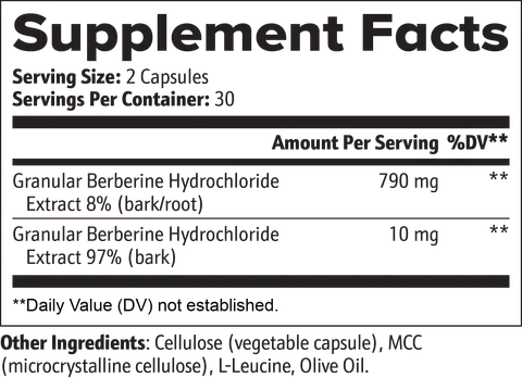 Ingredients:Â Granular Berberine Hydrochloride Extract 97% (bark), Granular Berberine Hydrochloride Extract 8% (bark/root), Cellulose (vegetable capsule), MCC (microcrystalline cellulose), L-Leucine, Olive Oil.Â